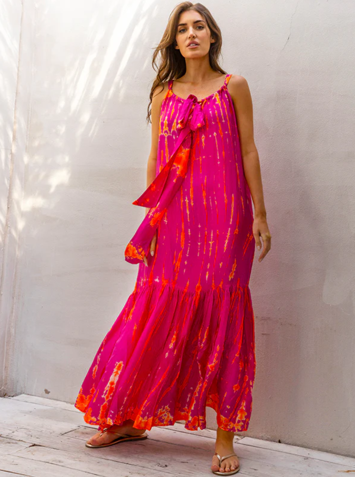 AKSD100 Magenta Tangerine Silk Tie Dye Sash Maxi Dress