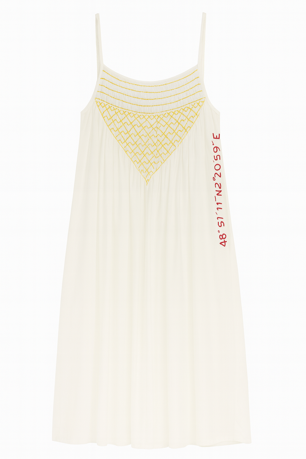 This elegant dress by the same designer features a flowing, minimalist silhouette with delicate shoulder straps. Crafted in a lightweight fabric, it is elevated by hand-embroidered yellow geometric detailing at the neckline and finished with the brand’s signature touch: a red GPS coordinate embroidery along the side. A refined yet effortless piece that blends artisanal craftsmanship with modern simplicity, perfect for both daytime elegance and relaxed evening wear.