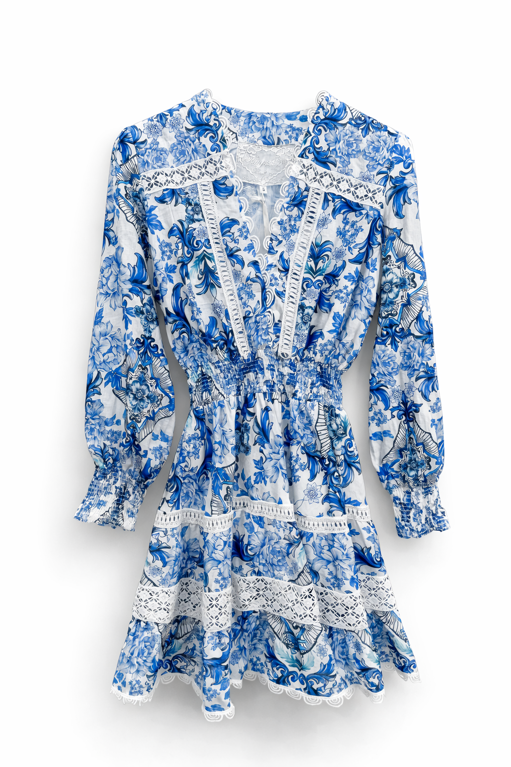 Elegant blue and white floral mini dress inspired by classic porcelain patterns. Designed with delicate lace detailing, a flattering smocked waist, and romantic long sleeves, this piece combines timeless elegance with effortless femininity.” ✨