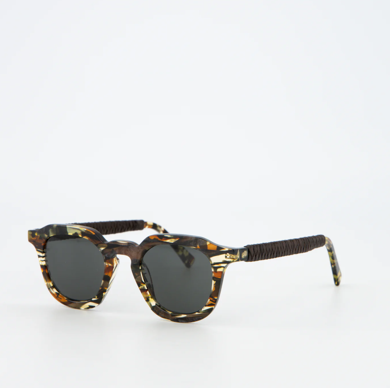 Expertly crafted in Italy, these sunglasses are made from premium plant-based "sandstonre" acetate by Mazzucchelli. They feature certified grey lenses that offer 100% UVA and UVB protection, reducing light transmission by 75% for exceptional comfort in bright conditions. The design is elevated by exquisite hand-braided leather detailing, meticulously handmade in Mexico.