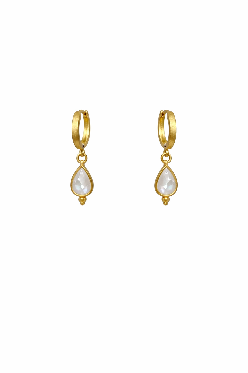 These elegant hoop drop earrings feature delicate teardrop-shaped moonstones set in gold-tone bezels. Refined and lightweight, they add a soft, luminous touch to any look.