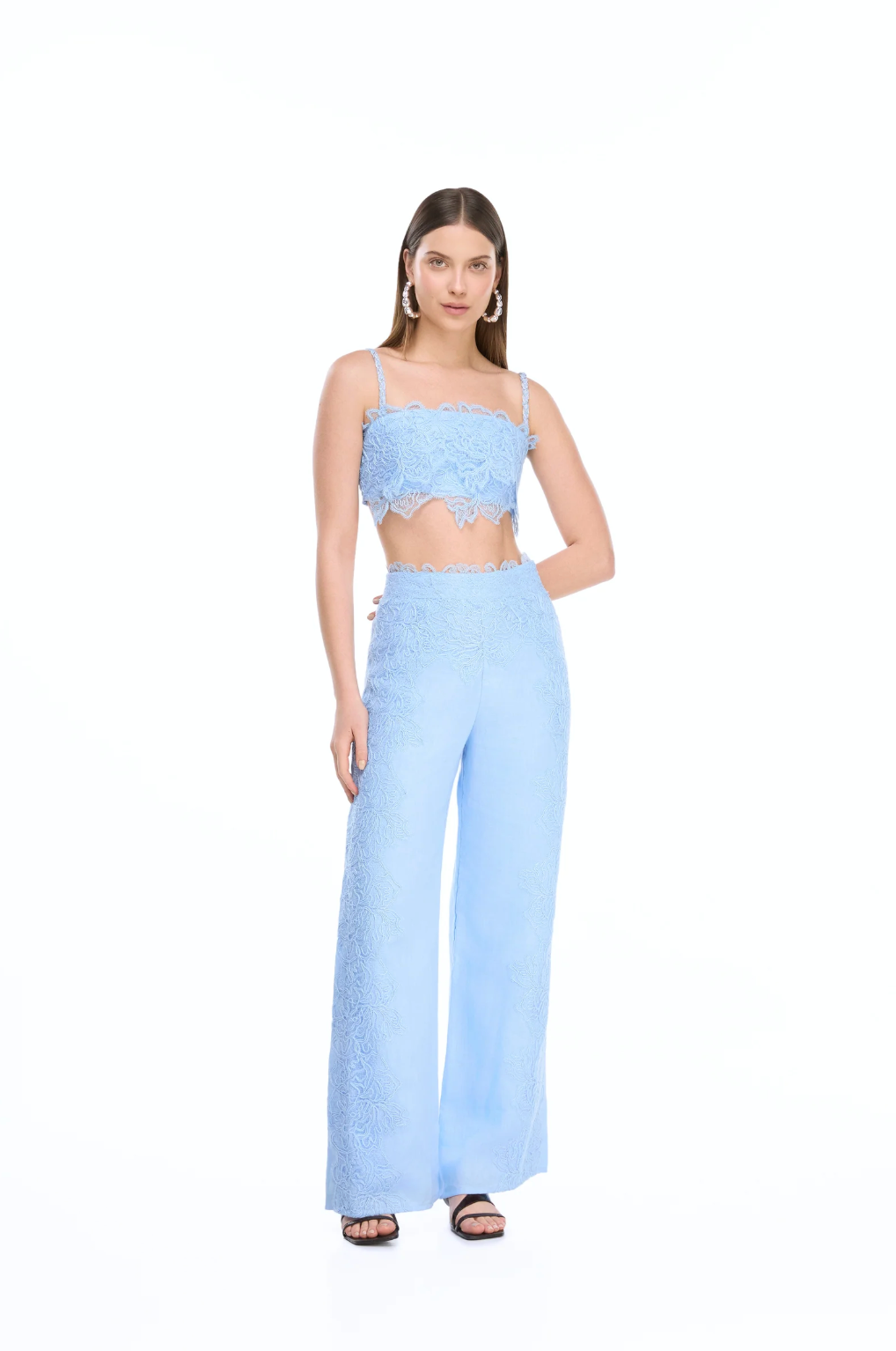 The Amanecer Top in Blue, crafted from 100% linen, radiates the freshness and purity of the day’s first light with a design that celebrates the most delicate expression of femininity. Its silhouette features thin straps and a subtle flare flowing from the bust, adorned with exquisitely crafted floral lace that traces romantic contours against the skin.
