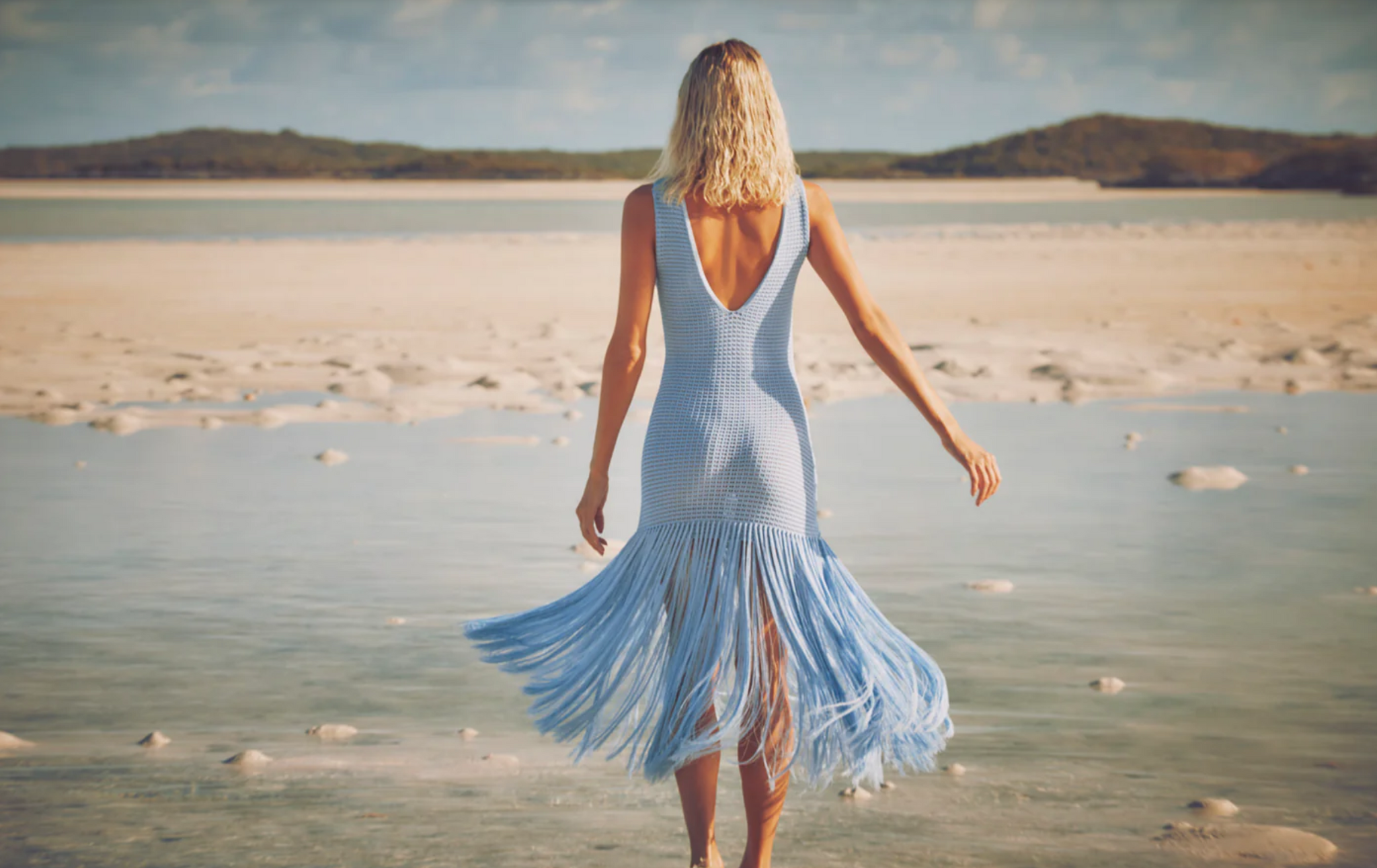 The Leiza is a stunning maxi dress featuring a striking V-cut open back and two layers of fringe that add fluid movement to the hem. Crafted in our Skylar hue, it blends elegance with a playful, textural finish—perfect for making a statement at any event.