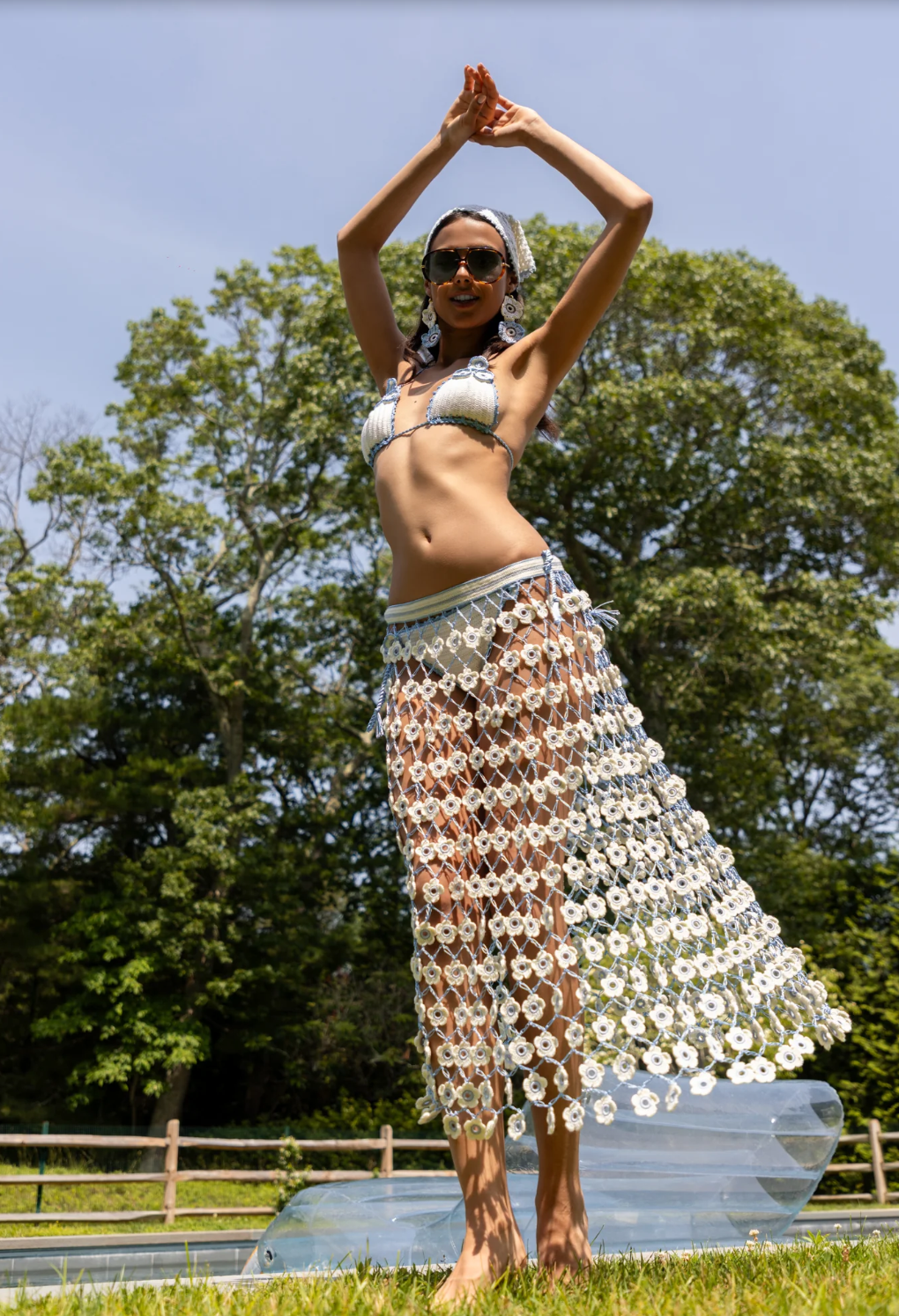 Our signature crochet maxi skirt, a beautifully versatile piece that can also be worn as an enchanting dress, is now adorned with romantic floral motifs. Carefully handcrafted by our skilled, fairly compensated artisans, this design blends sustainable luxury with timeless charm. The intricate floral detailing adds a soft, garden-inspired elegance, while the adjustable tie waist offers a comfortable one-size-fits-most fit. Perfect for pairing with your favorite swimwear or elevating your look for an evening affair, this maxi skirt is an essential for effortless, refined style.