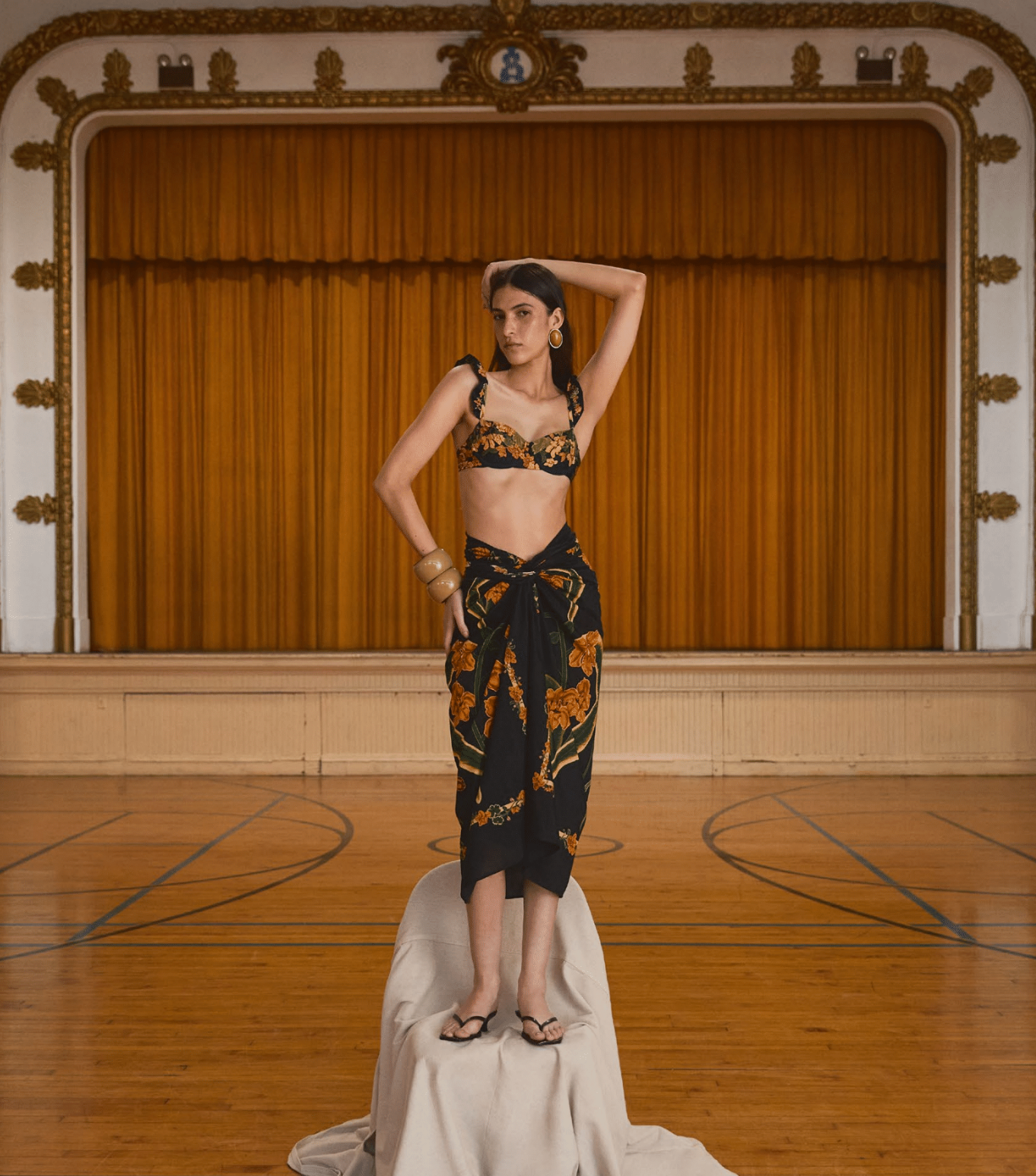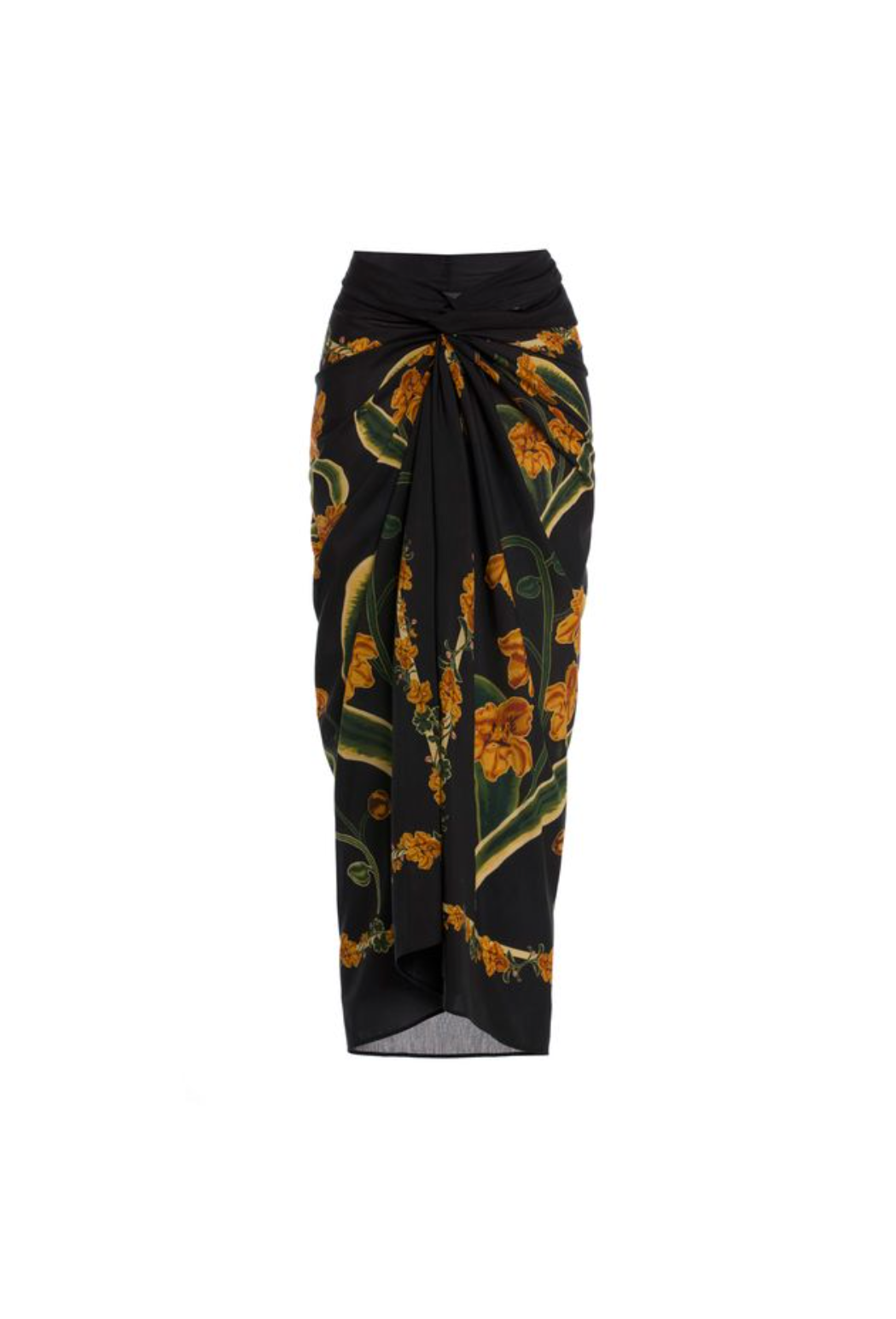 This elegant black wrap skirt features a striking floral print in warm golden and amber tones, bringing a bold yet timeless aesthetic to any summer outfit. Designed to be worn tied at the waist, it flatters the figure with its flowing, lightweight fabric and natural drape. Perfect for transitioning from beachside lounging to stylish evening plans, it’s a versatile piece that adds instant sophistication and charm.