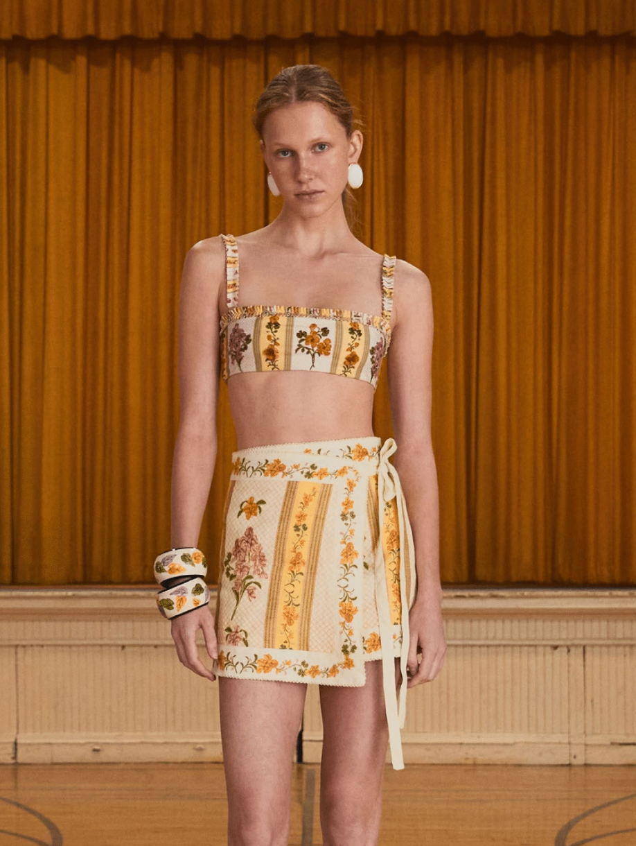 This charming short wrap skirt features a vintage-inspired floral and stripe print in warm tones of yellow, pink, and green over a soft cream background. The lightweight fabric and side tie design make it easy to wear and flattering on any silhouette. Perfect as a beach cover-up or paired with a matching bikini for a coordinated, elegant summer look.
