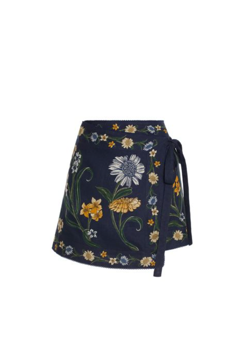 Short pareo-style skirt with floral embroidery in yellow and white tones on a navy blue background. Its wrap design with a side tie offers comfort and femininity — the perfect elegant touch to complete your beach outfit.