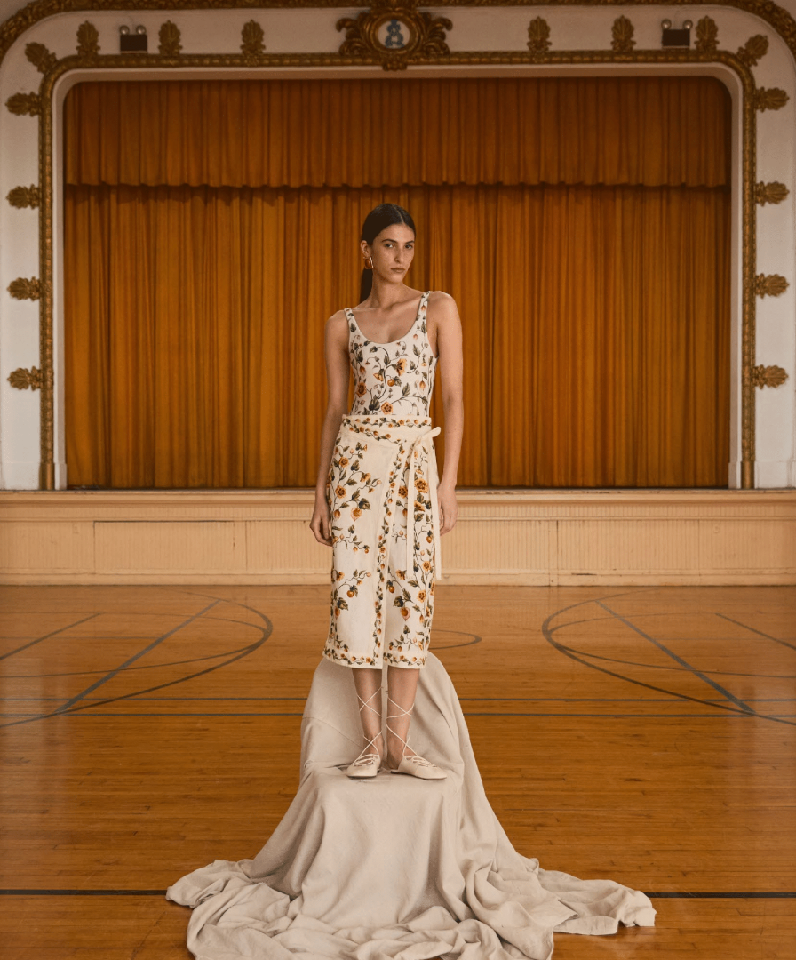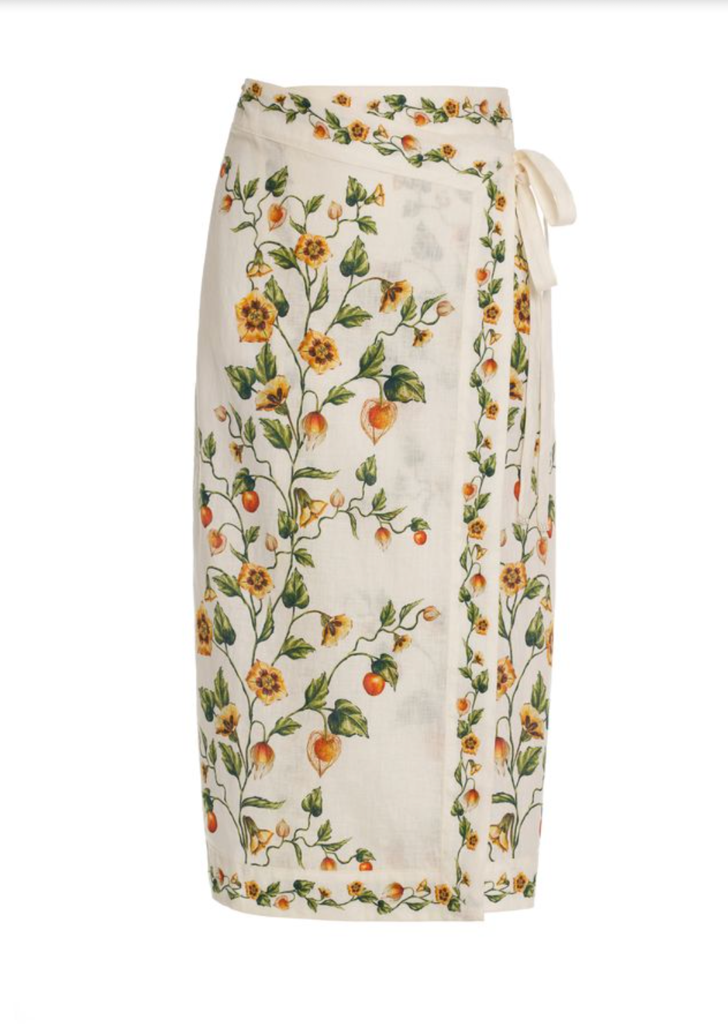 Elegant wrap skirt featuring a soft cream background with a delicate floral and fruit print. Its lightweight fabric and adjustable tie make it perfect for beach days or casual summer outings.