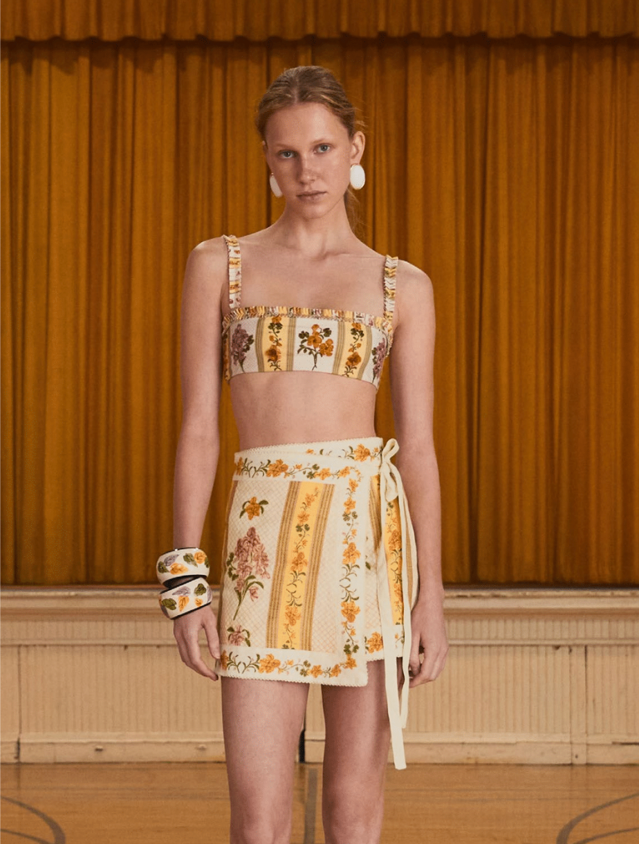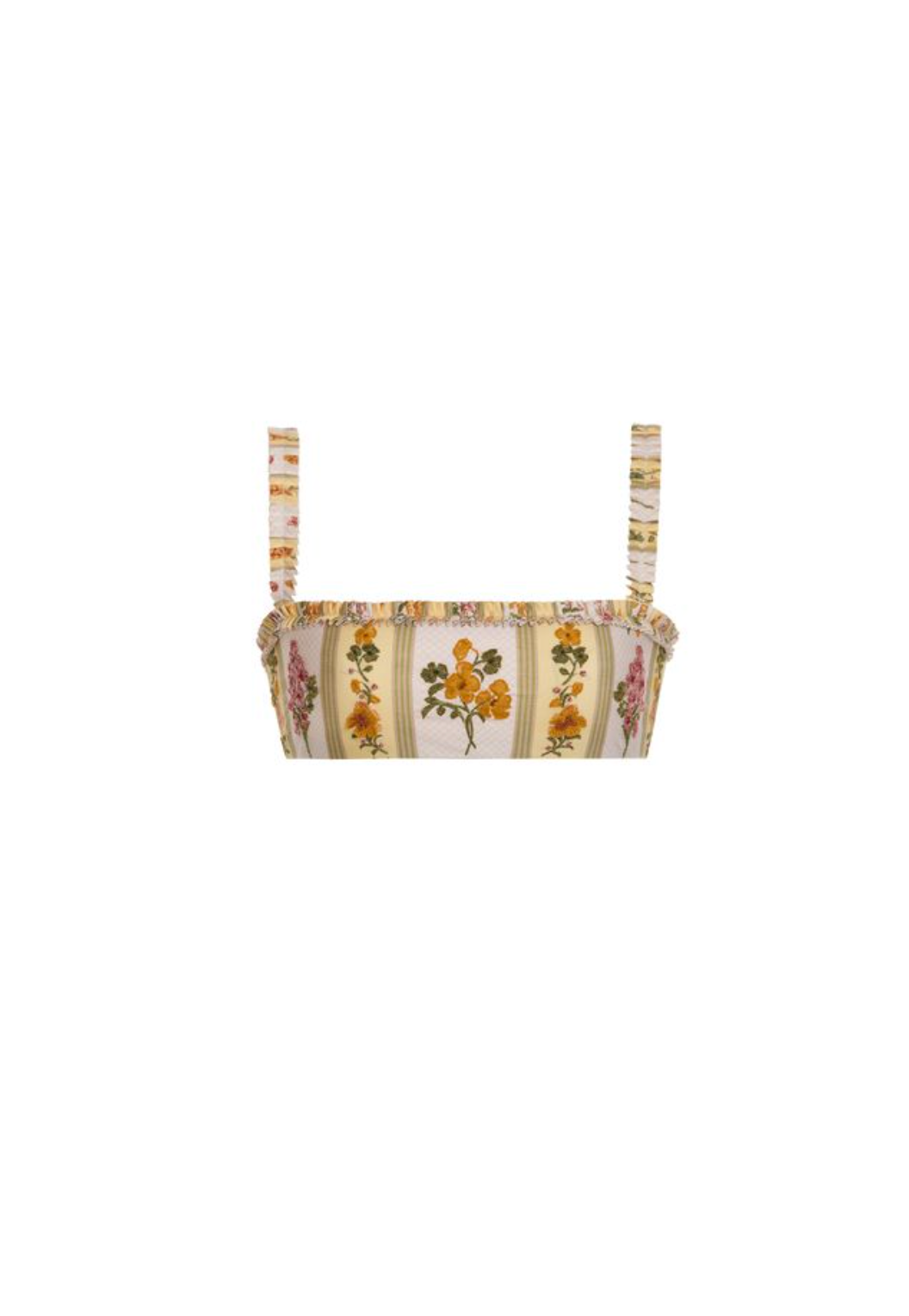 Charming and feminine bikini set with vintage-inspired vertical stripes and floral bouquets in soft yellow, pink, and green tones. The balconette-style top features delicate ruffle trim and structured cups for enhanced support and shape, paired with high-waisted bottoms that offer flattering coverage and a retro feel. This set blends classic elegance with playful detail—perfect for lounging poolside or enjoying a chic beach day.