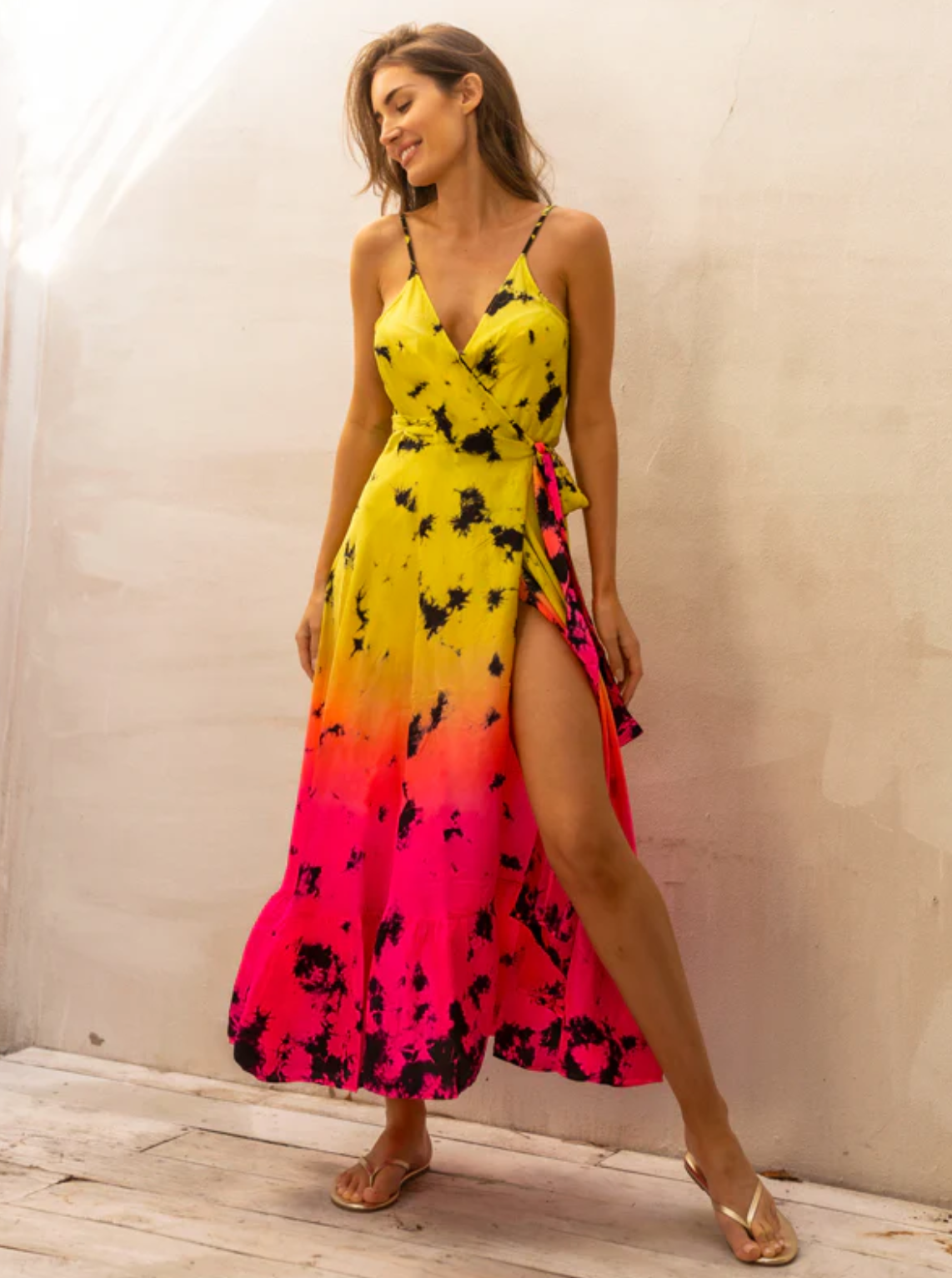 Our silk Tia slip midi dress in our signature Astral Neon colors has a free-spirited silhouette with a frill at the bottom. Tie-dyed by hand, so no two are the same and simply unique to the individual. This midi dress is a wrap style, allowing it to be adjustable. It blends utility, comfort and luxury. Embrace its simple elegance for any occasion.