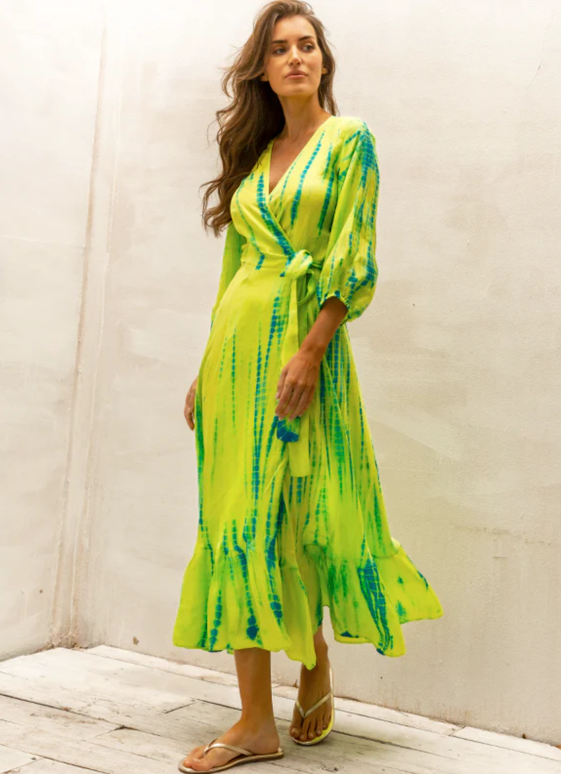 AKSWD58 Chartreuse Emerald Silk Tie Dye Puffy Sleeve Wrap Midi Dress